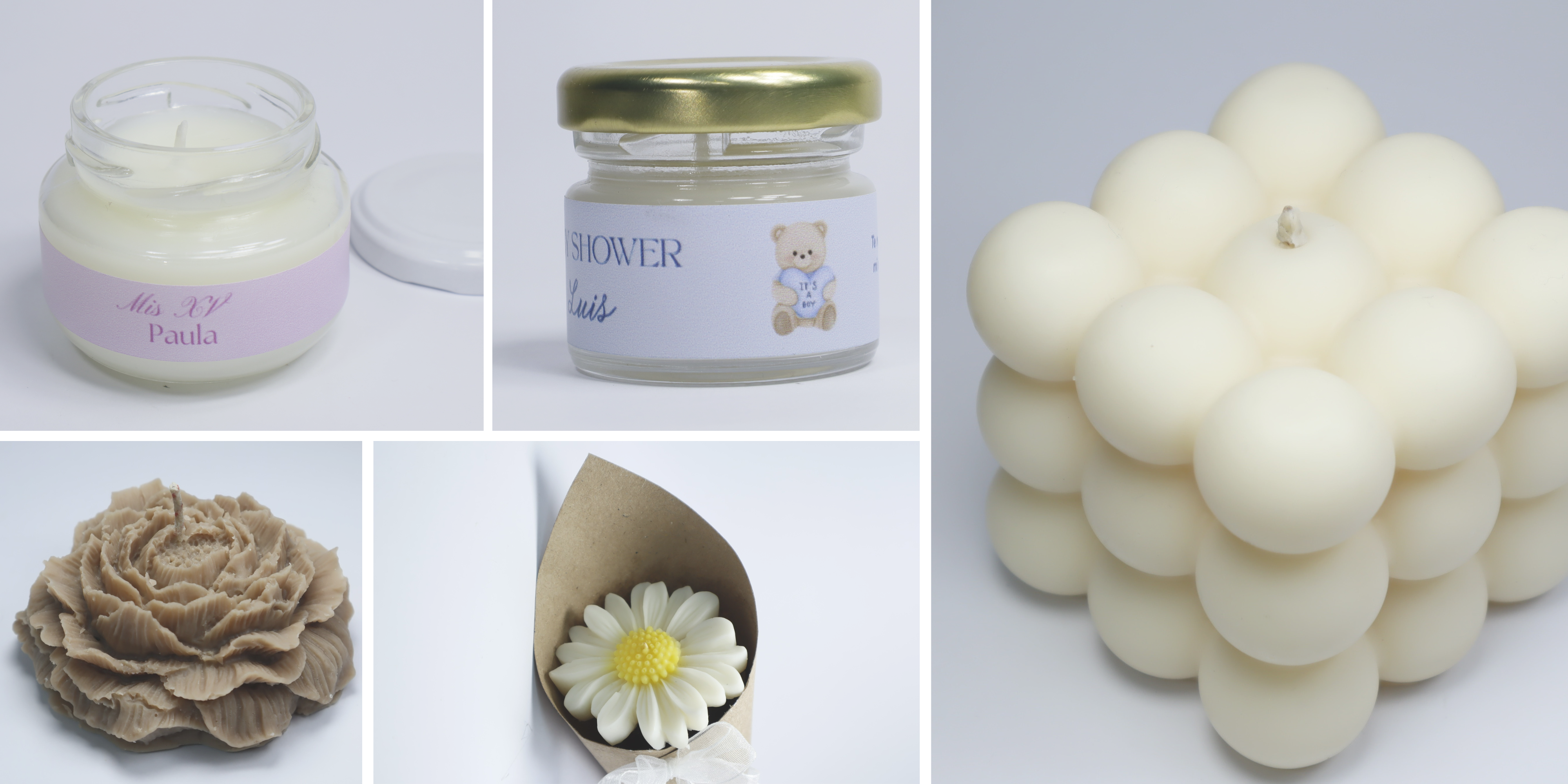 Nuestros productos en diferentes formas, tamaños, colores y aromas, con la finalidad de ayudarte a crear una experiencia única, con recuerdos que se adaptan a tus necesidades.